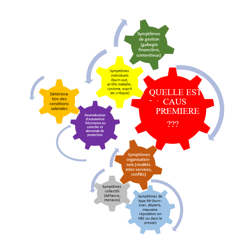 Le secteur AS est au cœur de cette problématique sans qu’il nous soit possible d’en comprendre la cause réelle. Quelques remèdes ont bien été proposés, tels que des supervisions d’équipe, des groupes de travail, des modifications d’organigramme…, du soutien individuel, mais rien n’y a fait. Demandé avec insistance par le secteur AS, l’audit est tout ce qu’il nous reste pour tenter de comprendre et d’amener du changement. »