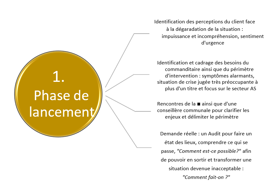 Dans le cas présent, dès la rencontre introductive avec le SRH de la commune, la demande initiale s’est focalisée sur l’urgent et prioritaire besoin de comprendre la situation globale du SCAS, avec des interrogations plus spécifiques autour du secteur AS, cœur de métier du Service et identifié comme un lanceur d’alerte :