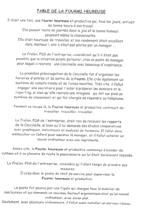 Vous comprendrez que je considère le fait que vous ayez fait coïncider cette fable à votre vision du vécu du service, comme plus que contre-productif. Cela n'est pas de nature à rendre confiance et apaiser les esprits au moment de votre départ. Je vous prie donc de ne plus propager ce genre de pensées négatives et défaitistes.