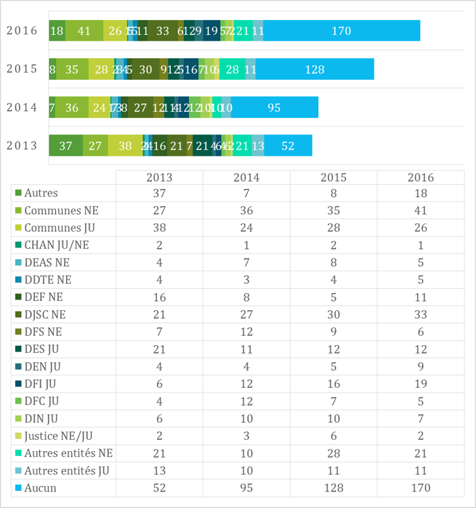 Les communes sont à l'origine d'environ 12 % des dossiers, chiffre légèrement en dessous de la moyenne des quatre dernières années (13.4 %).