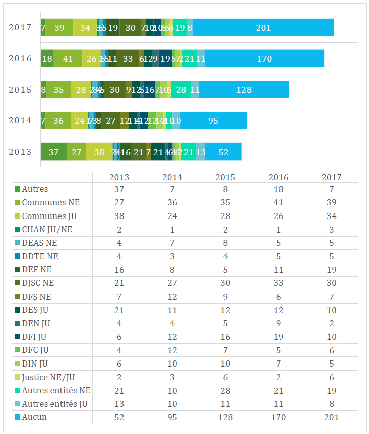 Le nombre d’ouvertures de dossiers est passé de 402 à 416 entre 2016 et 2017, soit une augmentation de 3.5 %. Le nombre de dossiers classés a lui aussi légèrement progressé puisqu’il est passé de 413 à 418. Quoi qu’il en soit, le rythme de clôture des dossiers dépend davantage de leur vitesse de traitement par les administrations que par le PPDT. Fin 2017, environ 105 dossiers étaient dans l’attente de nouvelles ou de réponses, alors qu’ils étaient 107 à fin 2016. Pour l’heure, aucune entité n’attend avec impatience une détermination du PPDT.